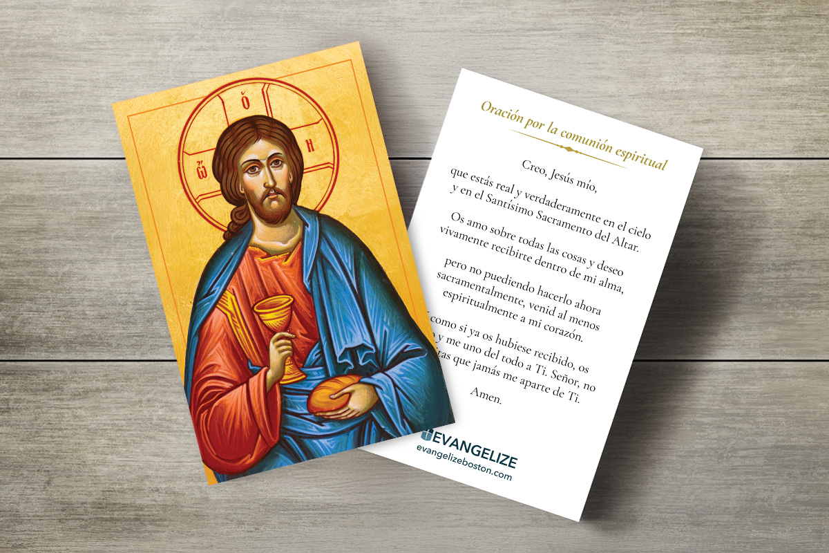 Cuando la Eucaristía no está a nuestro alcance, ¡podemos hacer una comunión espiritual! Compra un paquete de estampas para hacer una comunión espiritual para ti, tu familia o los feligreses que estén enfermos o confinados en casa. Un gran recurso para capellanes de hospital Ahora también disponible en español.