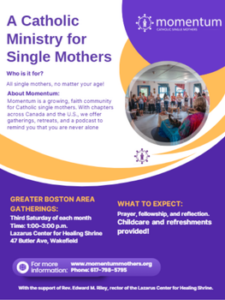 Are you a single mom or do you know one? If so, consider the local chapter of MOMENTUM at the Lazarus Center for Healing Shrine in Wakefield, MA under the spiritual guidance of Fr. Ed Riley. They meet every 3rd Saturday from 1-3:00 PM and childcare is provided. The dates are Oct. 18, Nov. 15, and Dec. 20. For more information or to register email the coordinator.