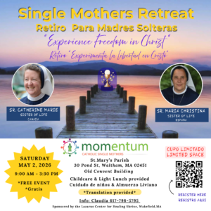 Are you a single mom or do you know one?If so, consider the local chapter of MOMENTUM at the Lazarus Center for Healing Shrine in Wakefield, MA under the spiritual guidance of Fr. Ed Riley. They meet every 3rd Saturday from 1-3:00 PM and childcare is provided. For more information, email or call 617-798-5795 the coordinator.